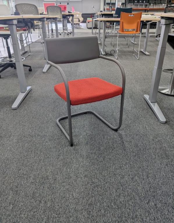 Description Add a pop of color to your space, with our Keilhauer guest chairs. They have a dark gray frame & a vibrant red seat. The sled style base ensures that it will not damage your floor.