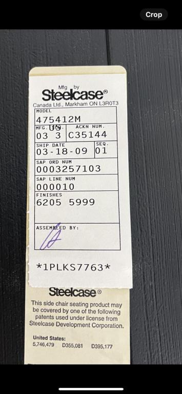 Description Steelcase Player stacking chair. 4 leg black frame. Fabric cushion pattern is predominately purple with yellow and blue line design (COM). Dimensions: 24" Wide x 19" Deep