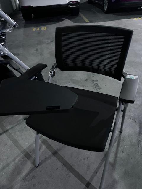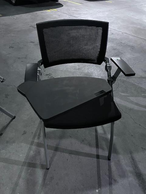 Description Black tablet on top. Tablet moves in and out and FOLDS DOWN and nesting (chair and tablet both nests). Nesting together for storage or not in use. Good condition. 1-10 =09