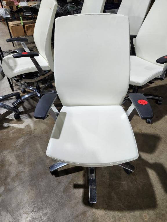 Description White leather adjustable arms, seat depth control, tilt lock, tension, swivel and pneumatic lift.