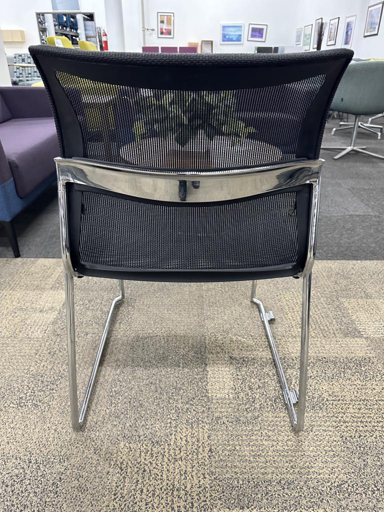 Description Pre-owned Stylex Zephyr Stack Chair. Black Mesh back and seat with a Polished Aluminum frame Sled base. Dimensions: 20" W x 18 1/2" D x 31" H