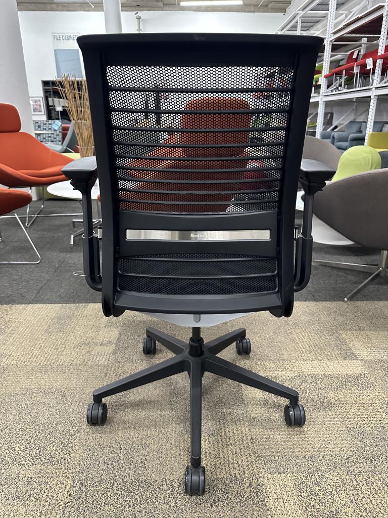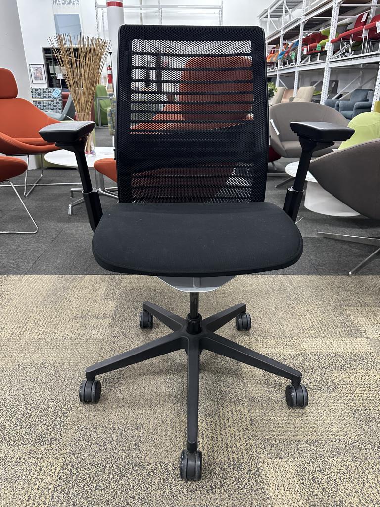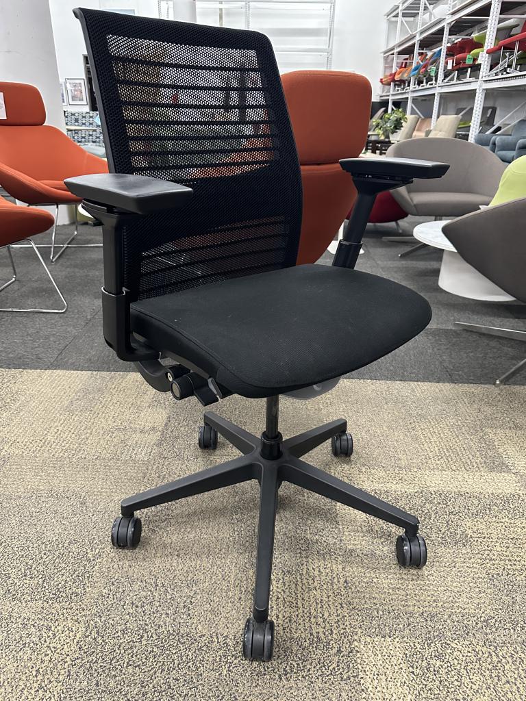 Description Pre-owned Steelcase Think task chair, has a Black Back, Black seat and Black (6205) frame with a 5 Star castered base. Ergonomic Functions: - Pnuematic Height Adjustable Seat - Height Adjustable Pivot Arms - Seat Depth - Flexible Seat Edge - Tilt Lock - Tension Control - Comfort Dial Dimesions - 28 W x 22" 24 1/4" Overall Depth - 37 1/2" - 42 1/2" Overall Height