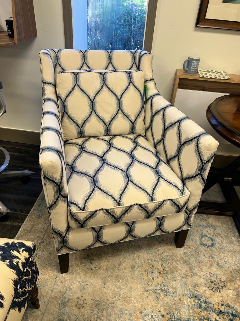 Description Blue and Cream Accent Chairs (Set of 2, Showroom Model) with Matching Back Cushions. Espresso wood legs and a contemporary design. Beautiful addition to a living room, waiting room, or reception area.