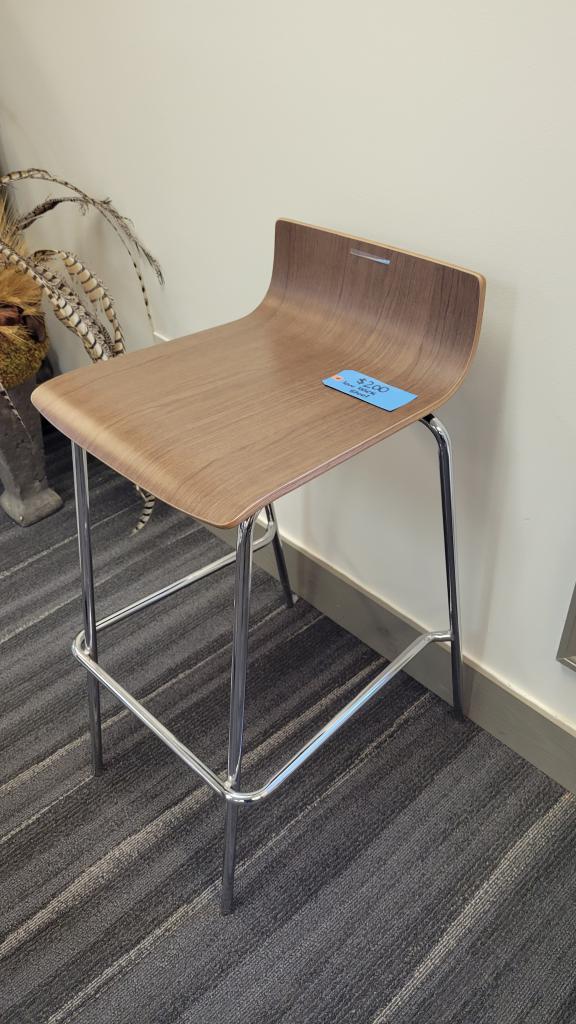 Description Maple Low Backed Stool. Contemporary design with silver metal base. Beautiful addition to any island, counter, or high-topped desk.