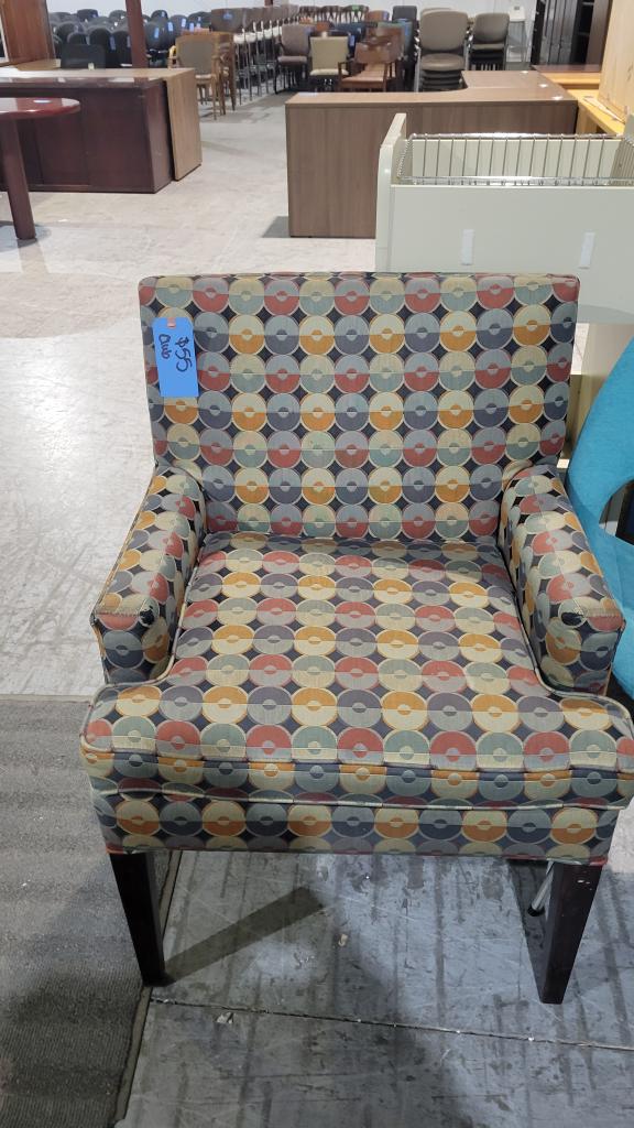 Description Fabric Guest Chair, with multi-colored design and espresso wood legs. Modern style, ideal for any home office, work space, living area, or waiting room.