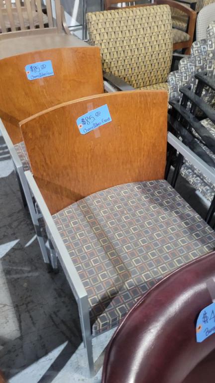 Description Cherry/Silver Guest Chair. Gray geometric seat with cherry back and silver base. Suitable for a waiting area, reception area, office, or living space.