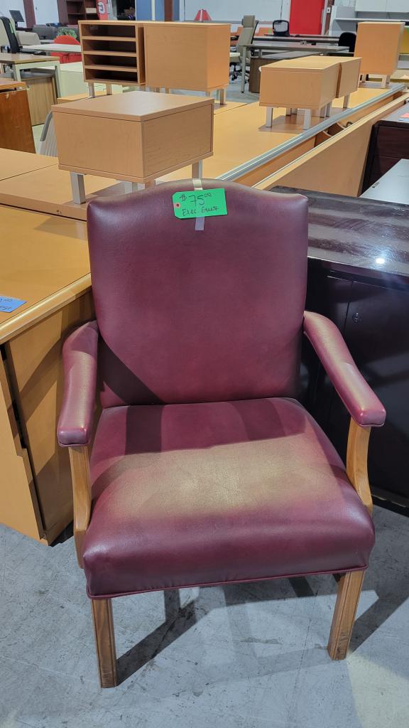 Description Burgandy Executive Guest Chair. Leather with oak arms and legs. Ideal for a home office, work space, living area, or waiting area.