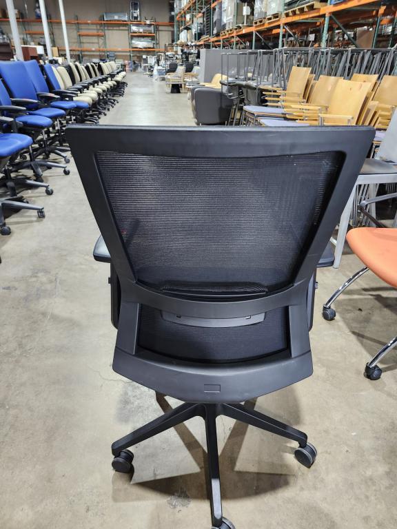 Description Black mesh back task chair with fabric seat. Lumbar, adjustable arms, tilt, swivel and pneumatic lift.