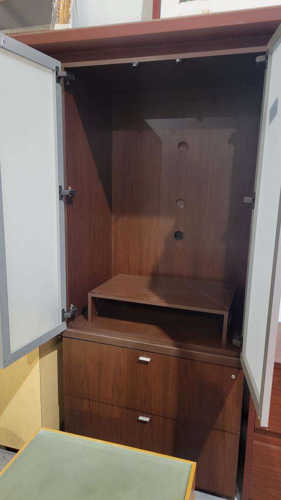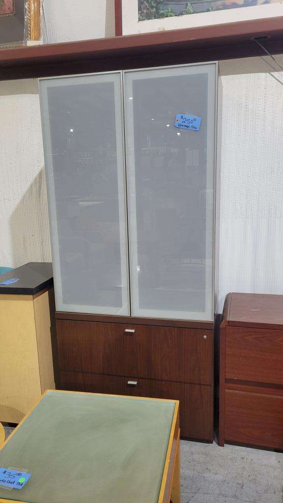 Description Walnut Storage Cabinet. 36" W x 79" T. Frosted doors and two file drawers. Contemporary look for a living area or a work space. Inner shelves.