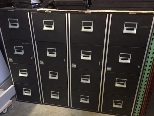 Description Victor Used Vertical Fire Proof File Cabinets. 4 drawers, vertical file, locking, black.