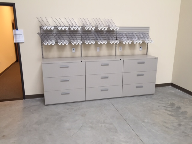 Description We had to get creative when a client asked us to design a dedicated storage space for them. We took some lateral files and placed a laminate top on them for additional workspace and storage. We have also taken some wall space and created some overhead storage as well as some desk space for copiers, faxes or other office equipment. We offer paper management systems, lateral files, vertical files, storage cabinets and bookcase options. Let us help design a storage space for you.