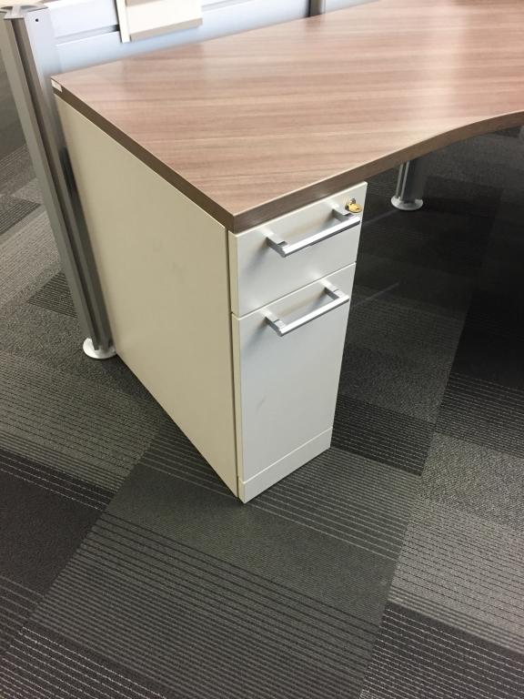 Description Steelcase 10" wide day pedestal, 2 drawers (6" and 17.5"), with lock and bar handle. These pedestals have wood with Clay Micro laminate exterior. Great for benching or building student desks.