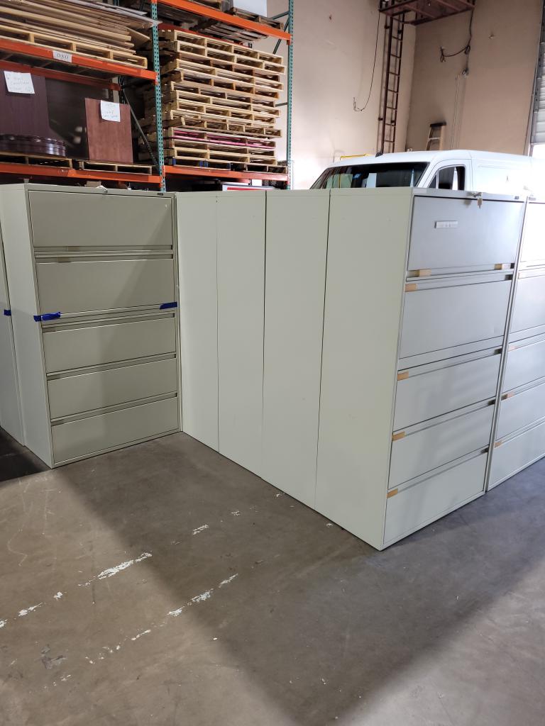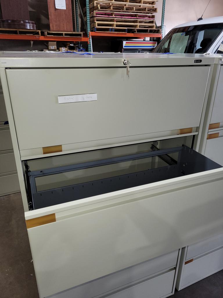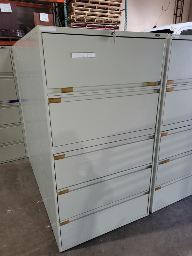 Description 36 inch wide 5 drawer metal in putty and tan colors with key.