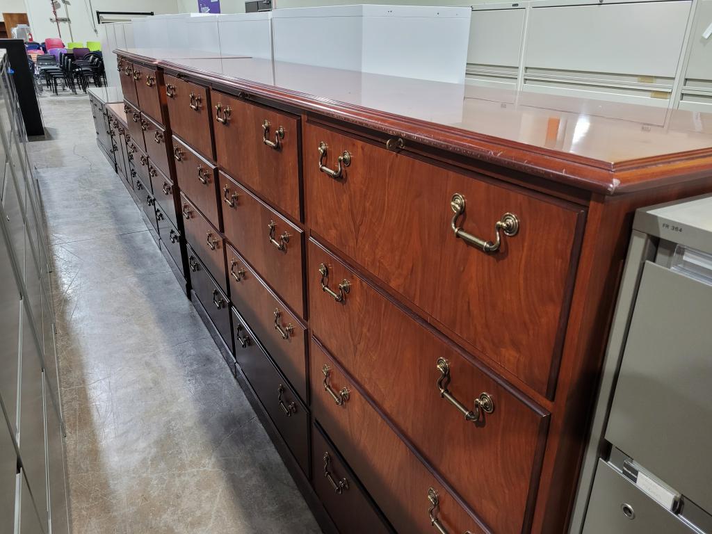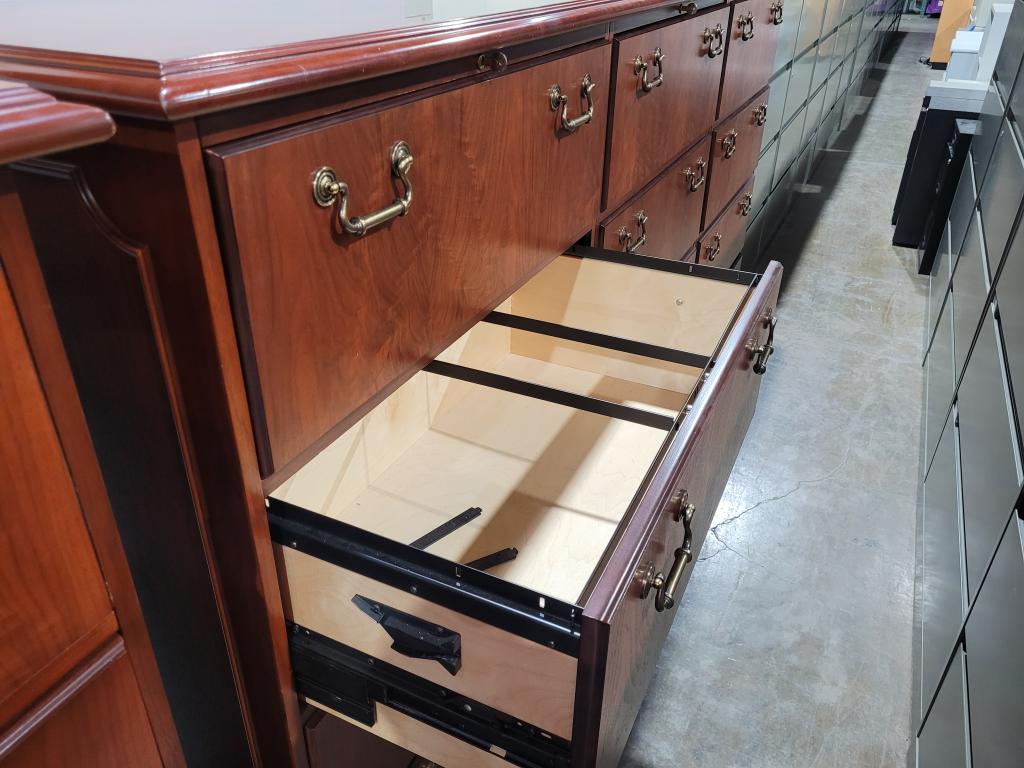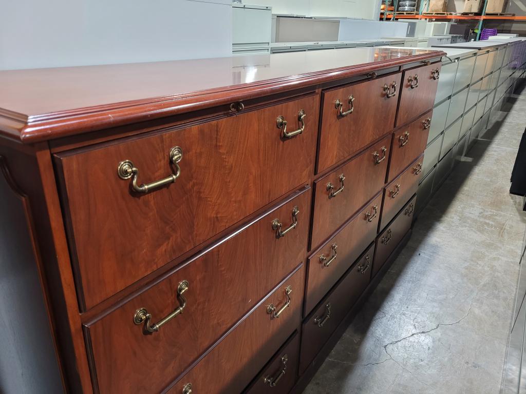 Description Mahogany wood veneer traditional lateral file with two 4 drawer high files under a common top. 72x21x54.