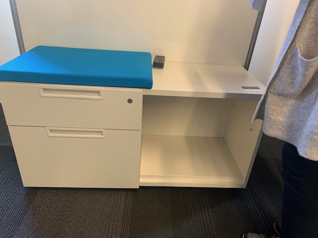 Description One side file cabinet Other side bookcase. Combination Mobile casters. 24"hx20"d Cushion aqua top-NOT avail.