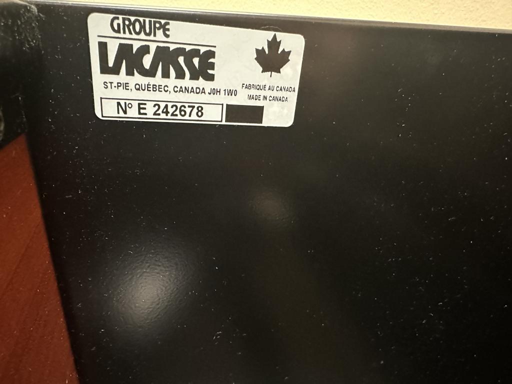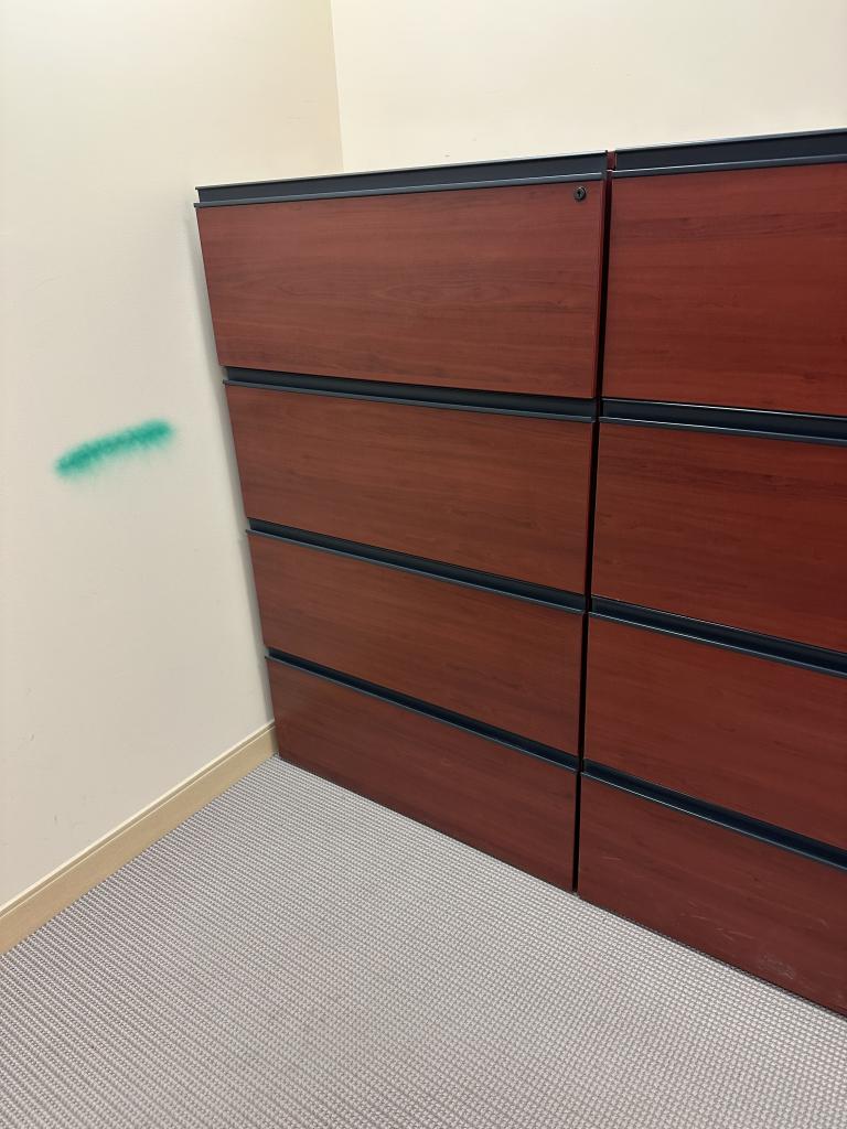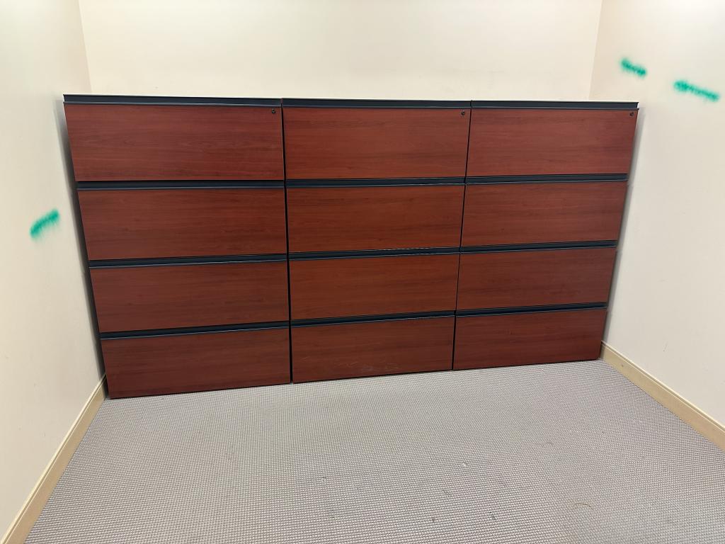 Description 4 DR Lateral File Cabinet by Lacasse Group in Cherry Wood Laminate Finish w/ lock & key, frames 36" x 19" x 58" H 6 Available used file, w/ normal wear & tear, overall in good working condition