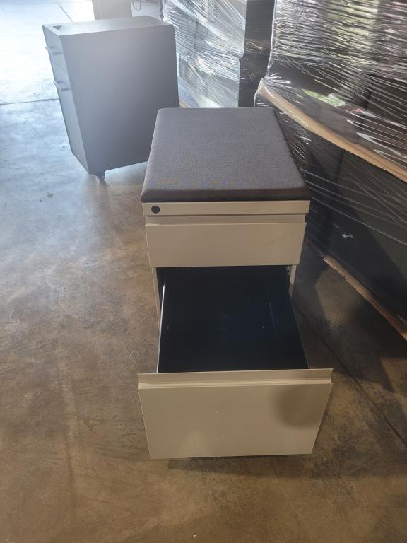Description Tan metal base with brown fabric top, two drawer one storage and one file with key.