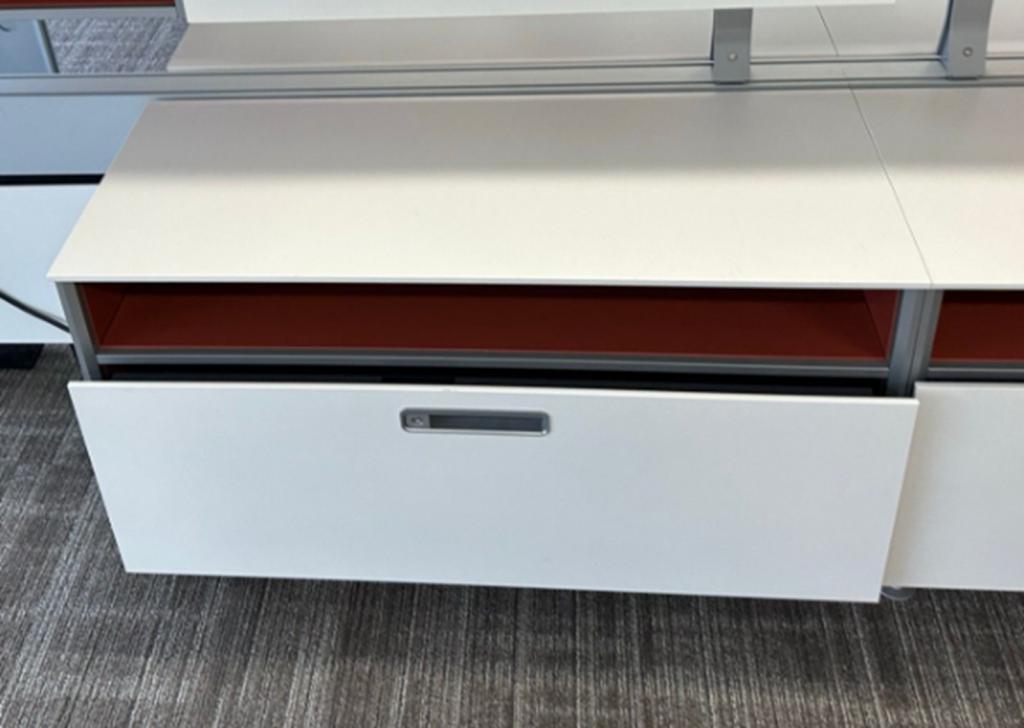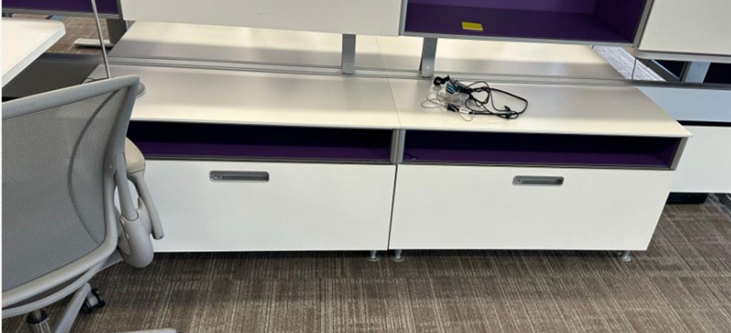 Description We have these Steelcase low credenzas in Purple, Burgundy, Green, and Yellow. Each credenza comes with a pull out drawer and a bookshelf. Should you want them painted all white add $99 per credenza