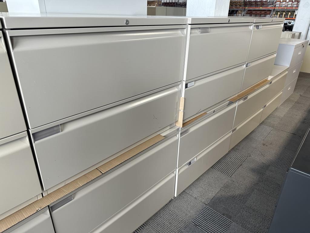 Description 2 DR Lateral File Cabinet in BeigeMetal Finish by Teknion Comes w/ Frames For Folders Comes w/ Locks and Keys 12 Available 36" x 18" x 27" H used File , w/ normal wear & tear, overall in good working condition