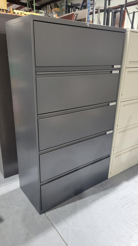 Description 5-Drawer Lateral File Cabinet. Commercial-grade file cabinet for use in a home office or work space.