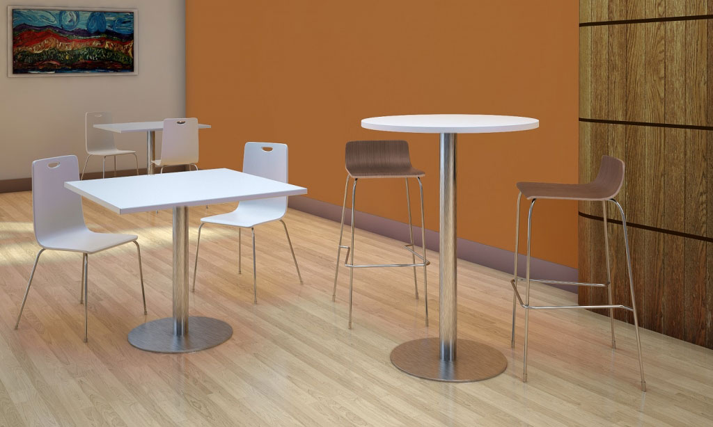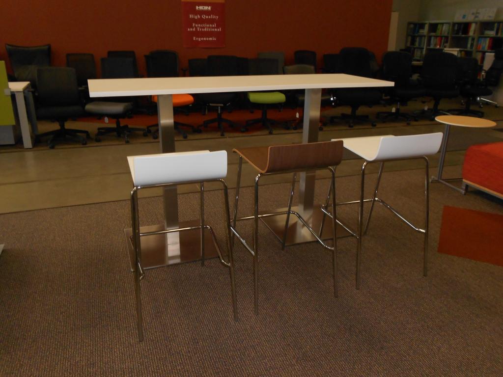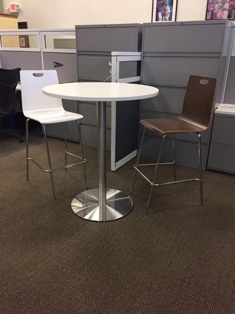 Description 84X36" STANDING HEIGHT CONFERENCE TABLES WITH 2 DISC BASES, BRUSHED ALUMINUM BASE - NEW AND 3' ROUND TABLES WITH METALIC BASE. CALL TODAY TO INQUIRE ABOUT THESE EASY, FLEXIBLE, "MODERN NEUTRAL" PIECES.