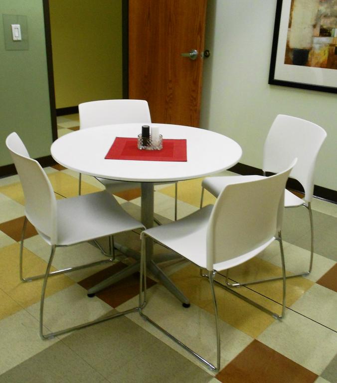 Description Breakroom Tables and With Chairs are now available from our Waukegan store. These tables and chairs are ideal for use in cafeterias and break rooms to auditoriums, training rooms, and small meeting spaces. The chairs would make for convenient side chairs. Contact us today for pricing and availability.