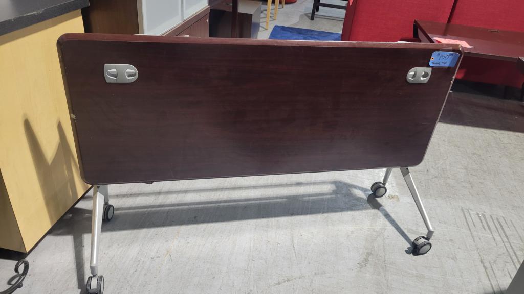 Description Mahogany Mobile Training Table. 5 Ft laminate rolling table with 2 grommets for wire management. Suitable for any work space or home office.