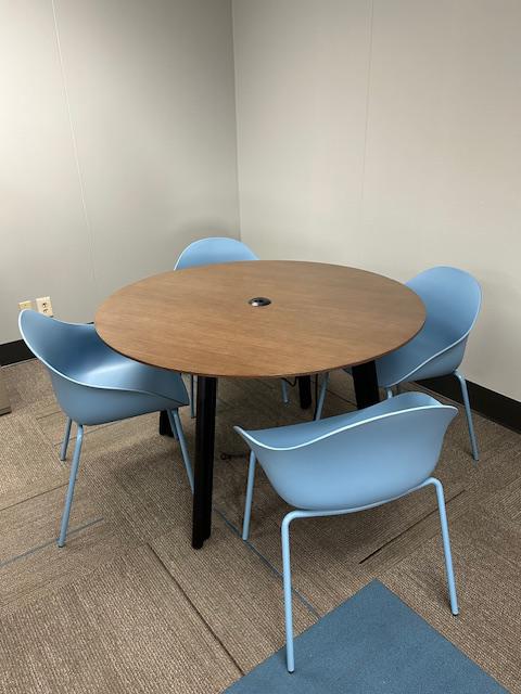 Description 48" Round Table w/modular power, walnut finish and black legs. Great condition!