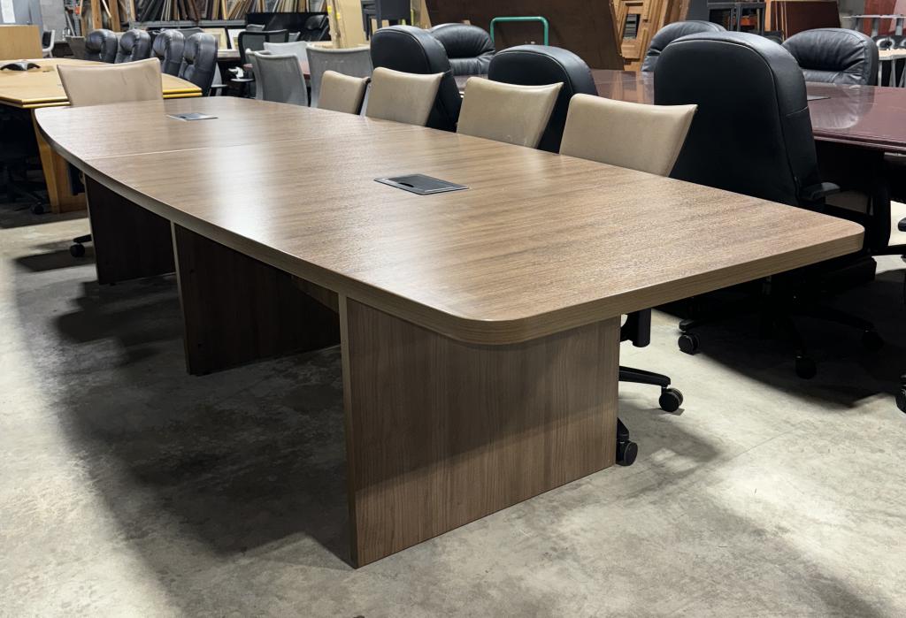 Description This 12' Laminate Boat-Shaped Conference Table offers a spacious and stylish meeting solution. With a sleek, curved boat shape, it provides a modern aesthetic, while the durable laminate finish ensures longevity. The table features integrated power grommets for seamless connectivity during meetings, making it perfect for both collaborative and executive settings.*WHS_0924*