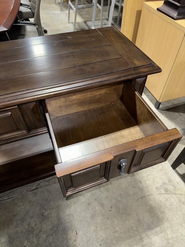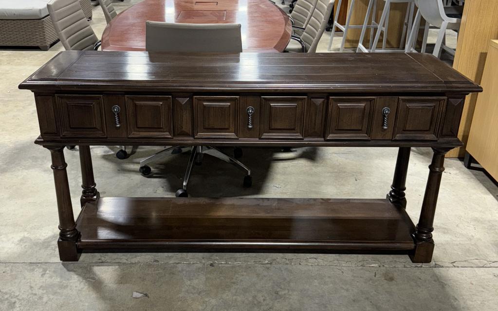 Description This classic console table blends retro-modern elegance with a rich cappuccino veneer finish, highlighted by distinctive gunmetal spiral pull handles. Expertly crafted, it features three drawers for discreet storage of small items like keys, knickknacks, and more, making it a stylish and functional addition to any space.*WHS_0924*