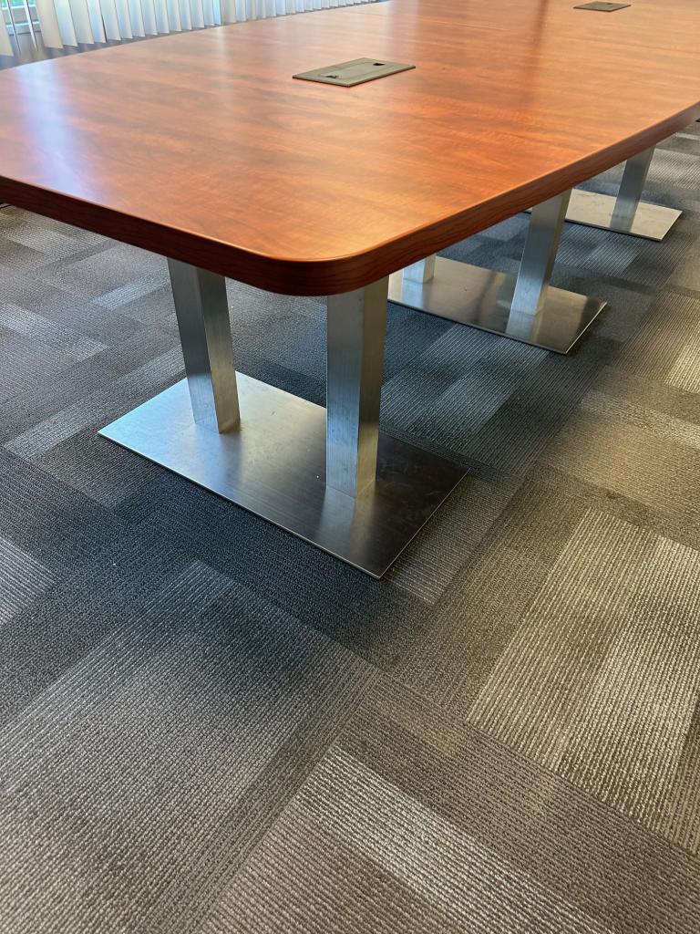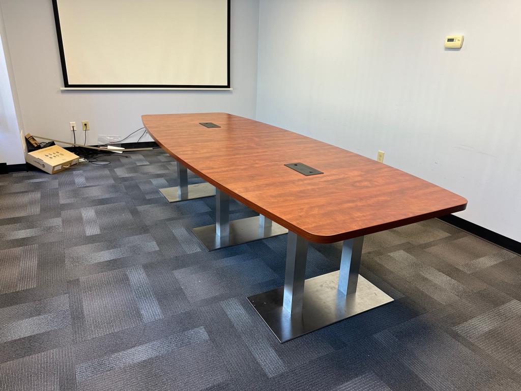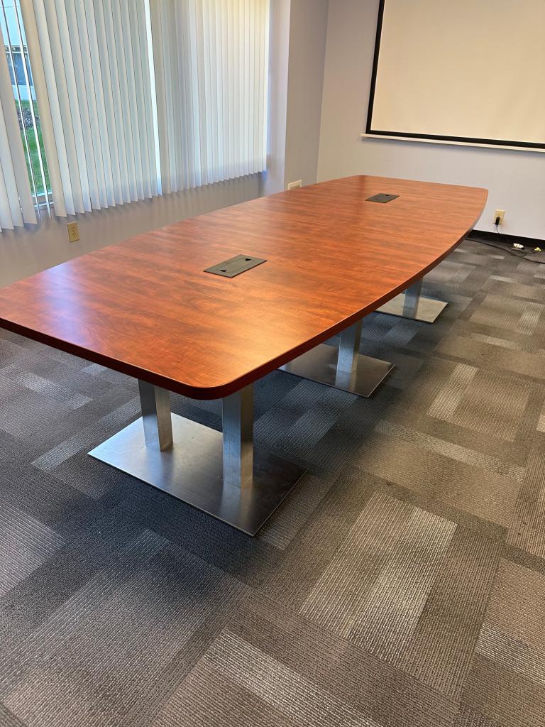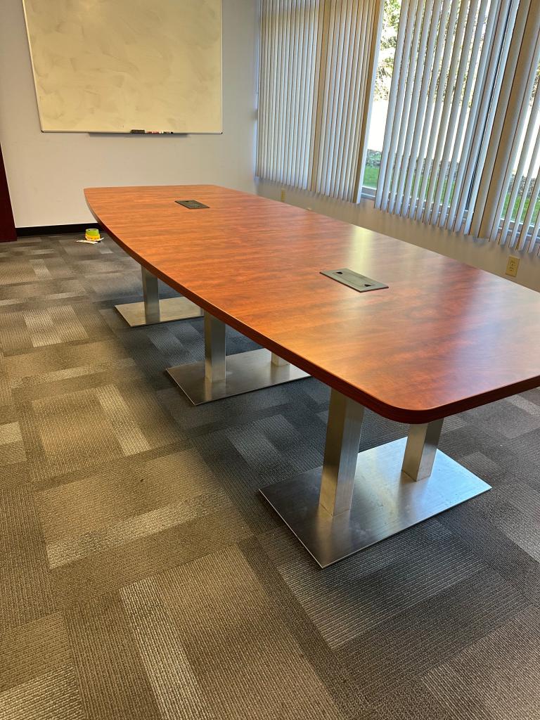 Description 10' Conference Table in Cherry Laminate Finish 2 Piece Top , 2- 5' Tops 10' x 4' x 29" H Boat Shape Pre-owned Table , w/ normal wear & tear, overall in good working condition
