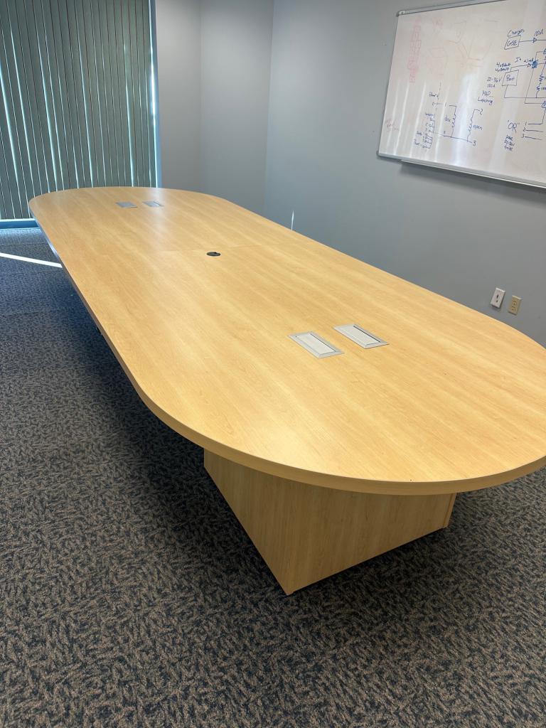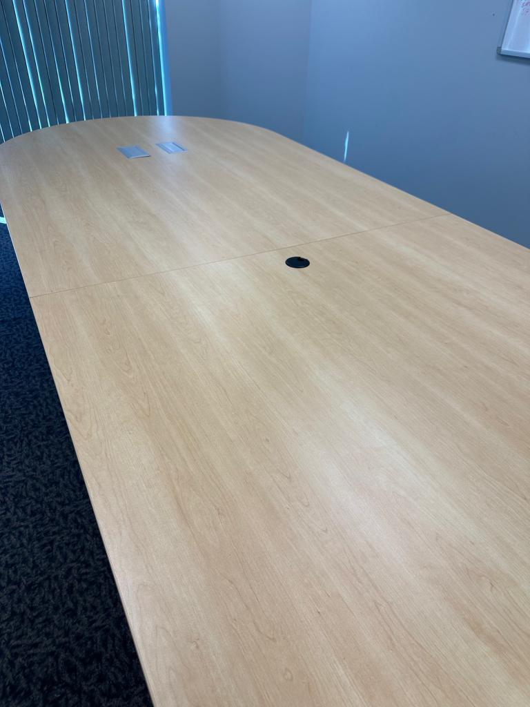 Description 14' Conference Table in Maple Laminate Finish 14' L x 5' W x 29" H 2 Piece Top Comes w/ Power Pre-owned Table , w/ normal wear & tear, overall in good working condition