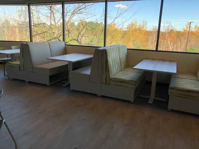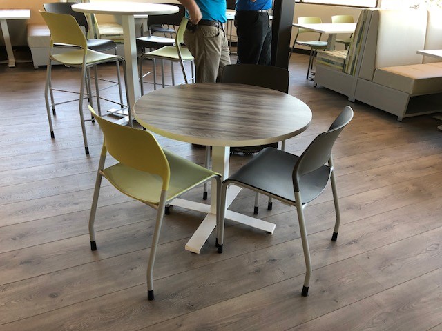 Description New Cafeteria tables in several shapes, sizes and heights - rectangular, square, round. Lots of laminate colors to chose from. Tables can be paired with easily cleaned plastic stacking chairs and/or colorful banquette seating.