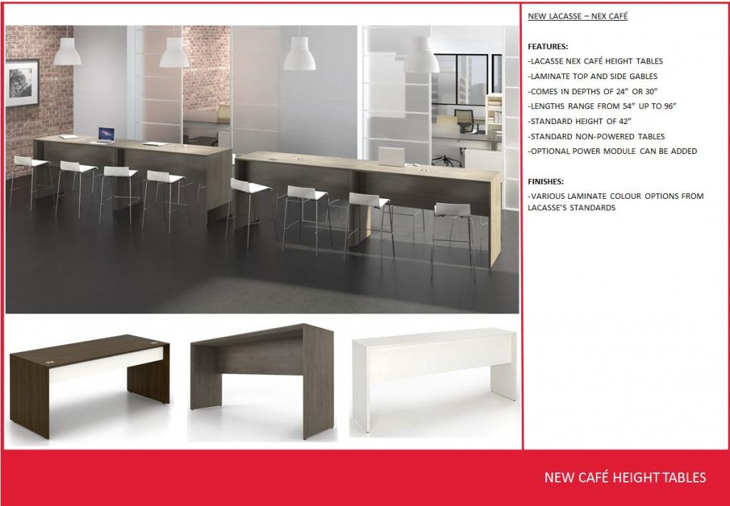 Description New Lacasse Laminate Nex Series Café height tables are perfect for meeting and lunch room applications. They are available in a wide variety of colours and sizes and power and communications modules can be added.