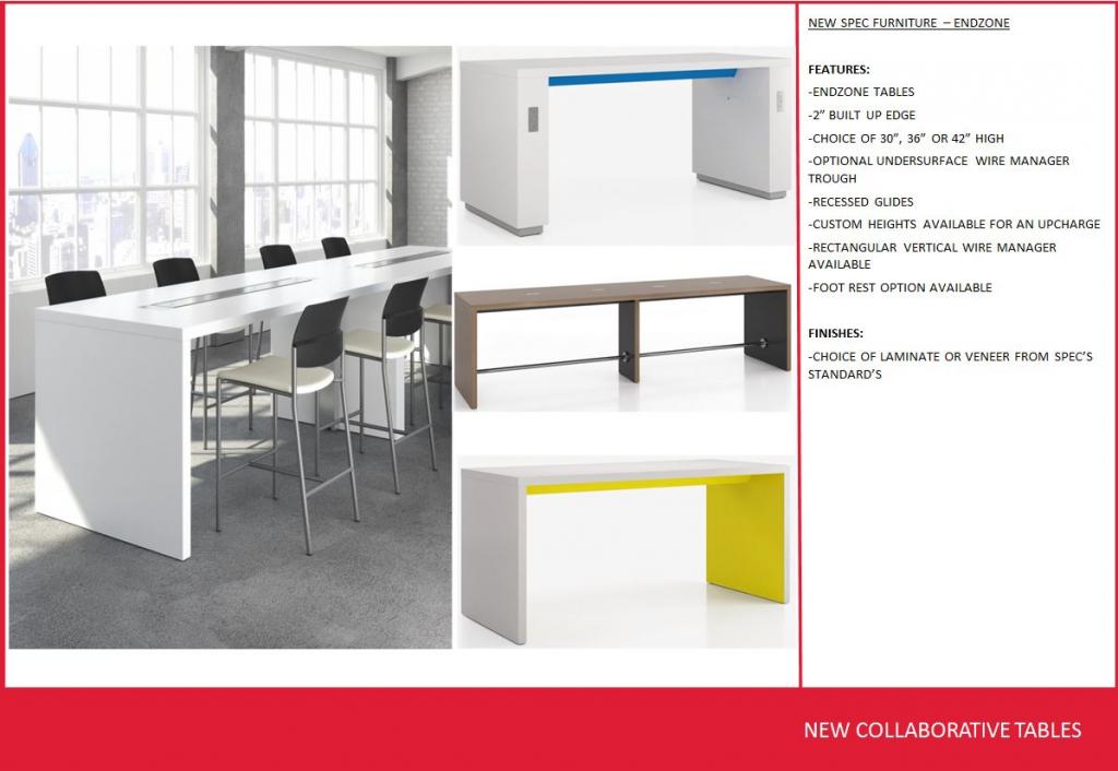 Description New Spec Endzone Series Tables are available in a 30", 36" or 42" height and a wide variety of sizes, finishes and base colours and with the flexibility to accommodate power and communications modules.