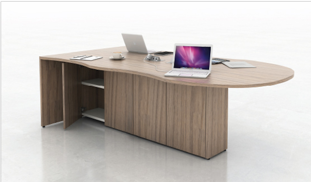 Description This table is a great way to simultaneously incorporate people, electronics and storage. The unique "peanut" shaped table top, allows for everyone to have "their own area". The table also provides areas for plugging in electronics, such as laptops or desktops. While the near table length base, offers storage for commonly needed supplies or documents.