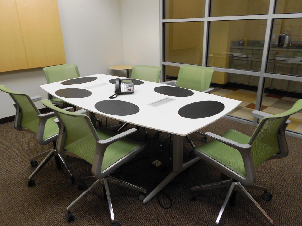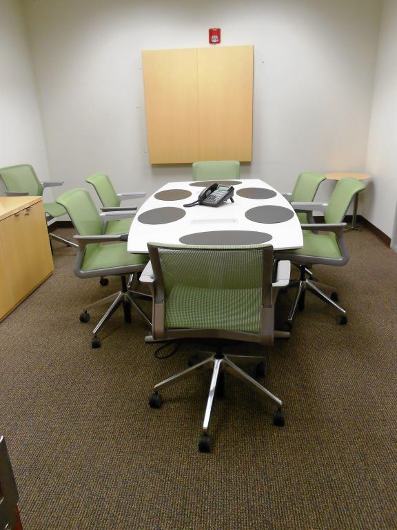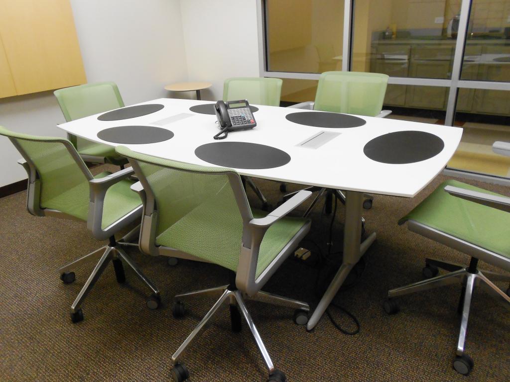 Description Modern Conference Table with Mesh Chairs now available in Waukegan. The boat shaped conference table measures 84"x42" and has (2) flip up electrical/data modular ports. A crisp, clean white laminate and a metal base gives this table a fresh modern look.