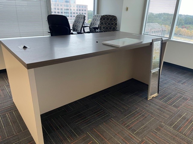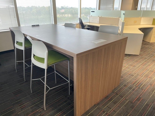 Description Looking for a sleek and functional high-top table for your office or workspace? Look no further than our 8-foot Virginia Walnut high-top table, perfect for meetings, brainstorming sessions, or even casual work sessions. Standing 40" high and 48" wide. We have 6 that are Virginia walnut and 4 that have a Virginia Walnut top with eggshell white legs. *WHS*