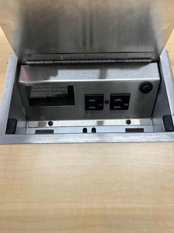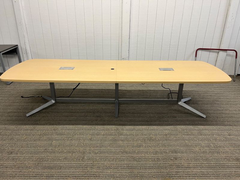 Description Maple laminate 2-piece conference table with (2) 2-outlet power modules, center grommet, and tungsten bases. Rounded edges on ends. Dimensions: 10 Ft Long x 3.5 Ft Wide CT39