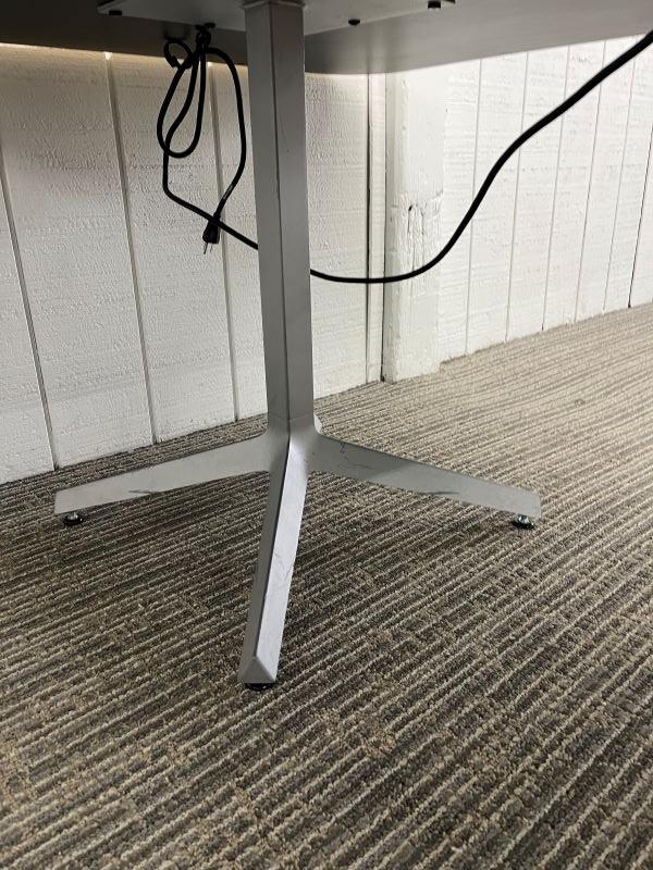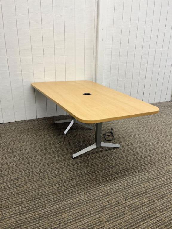 Description Maple laminate conference table. Trapezoid shape. Tungsten bases. Wider end is supported by X base and shorter end is supported by I base. (1) Black power module with (1) outlet.