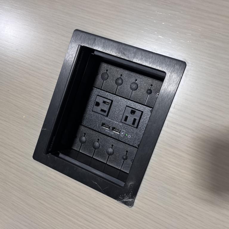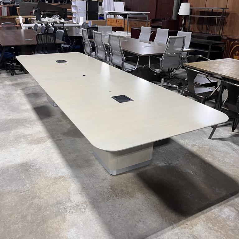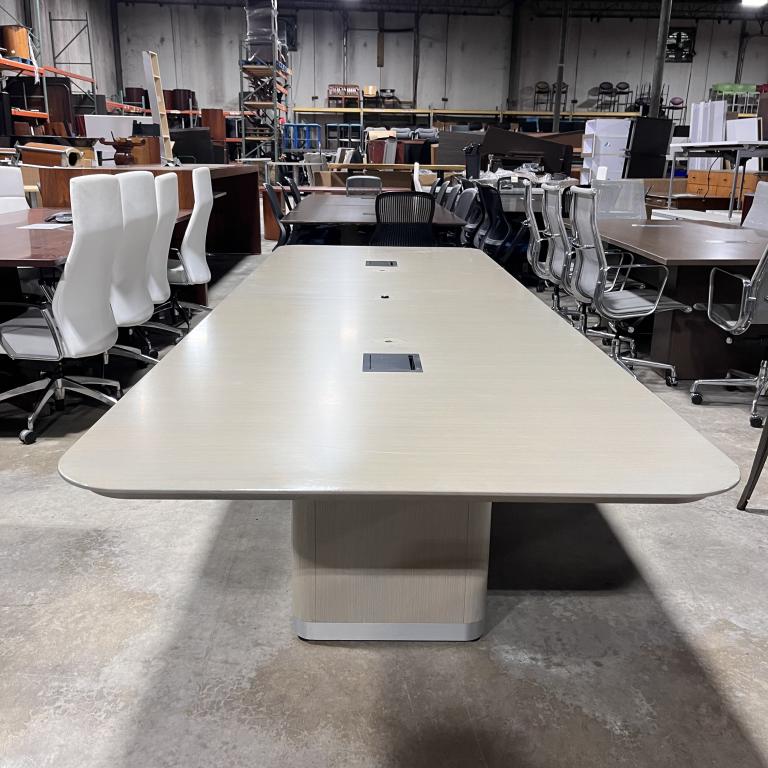 Description Pre-owned 12-foot conference table from Knoll, designed with a light ash laminate finish. It seats 8 to 10 people and even comes equipped with power outlets right on the tabletop. Ideal for your office meetings! *WHS*