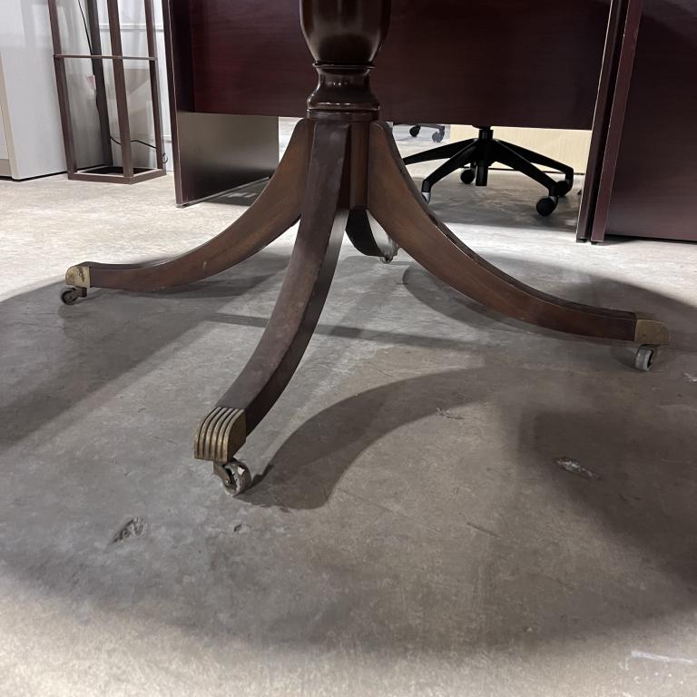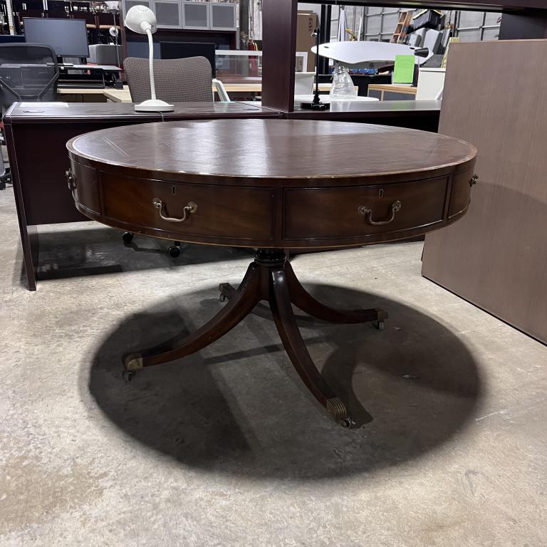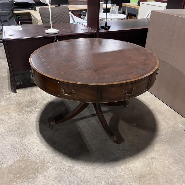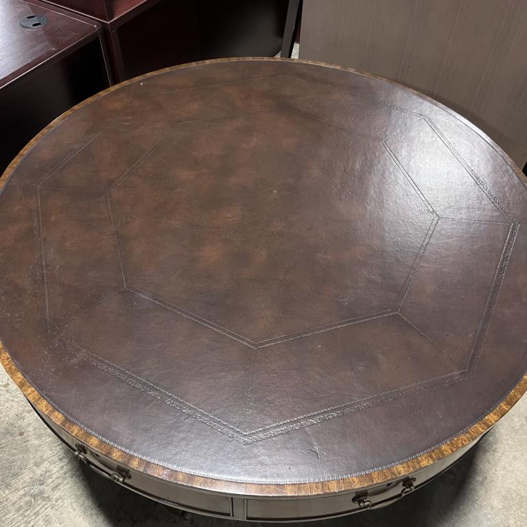 Description This distinctive table features a walnut veneer finish that beautifully complements its leather tabletop adorned with a detailed octagonal engraving design. With four functional drawers, it is not only aesthetically pleasing but also practical. The table is in good condition, ready to enhance any space.