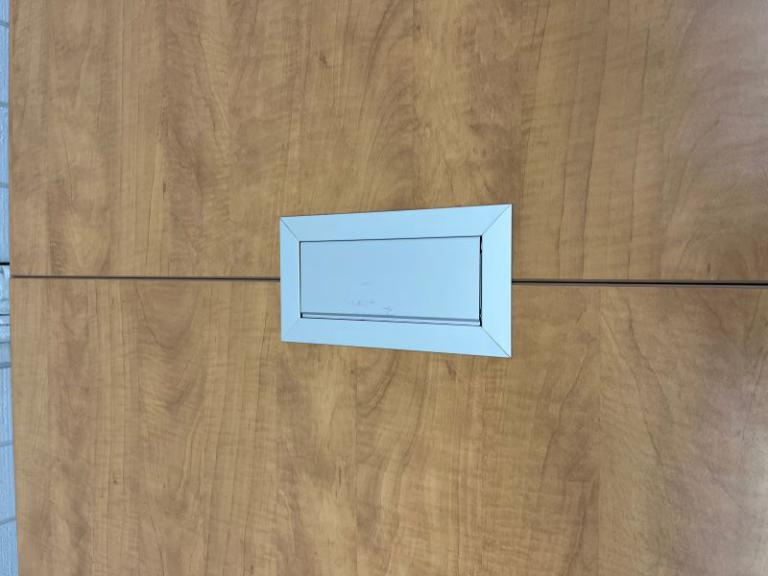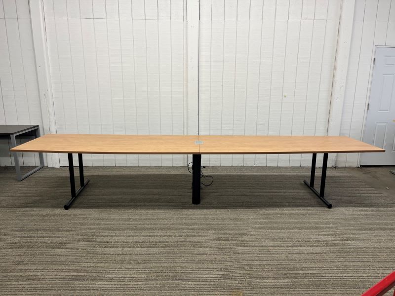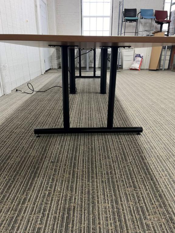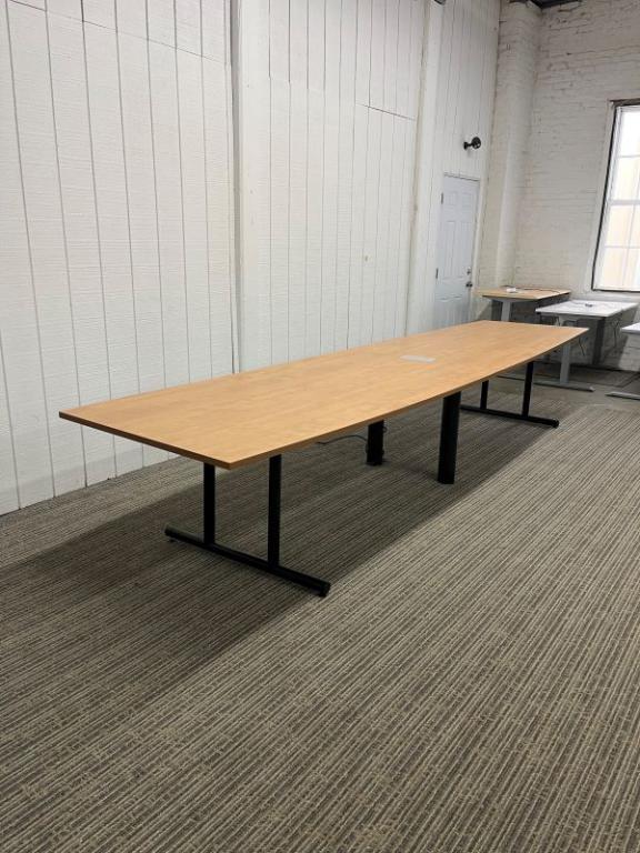 Description Bow-shaped conference table. Walnut laminate surface. Supported by (2) double T-shaped legs on ends and (2) 4" bullet post legs in middle. Center power module with (3) outlets.