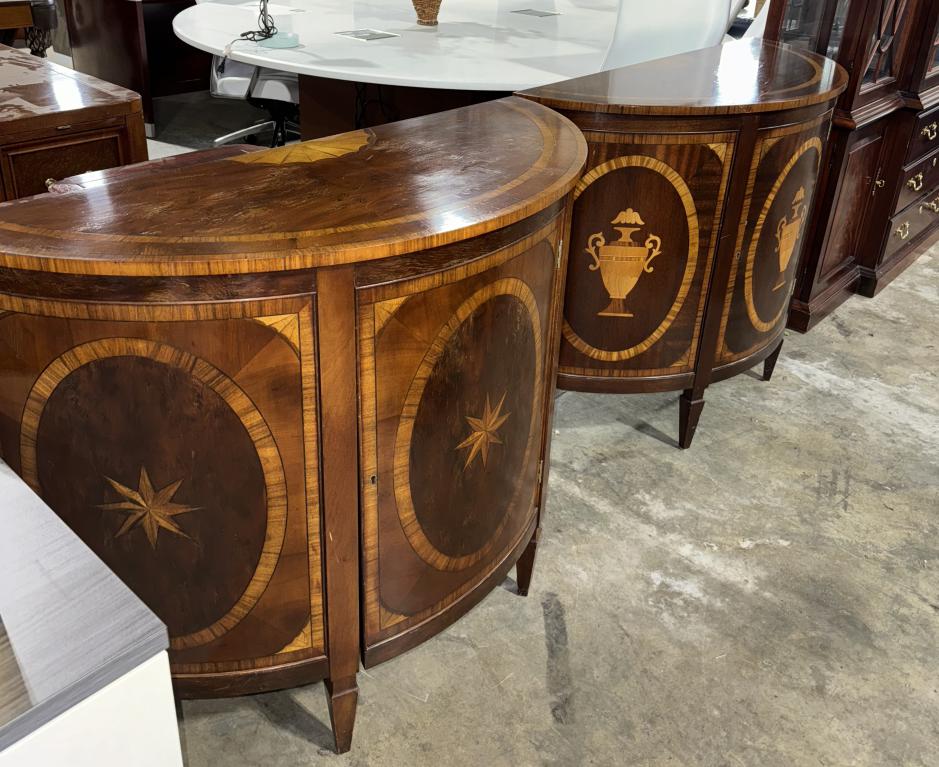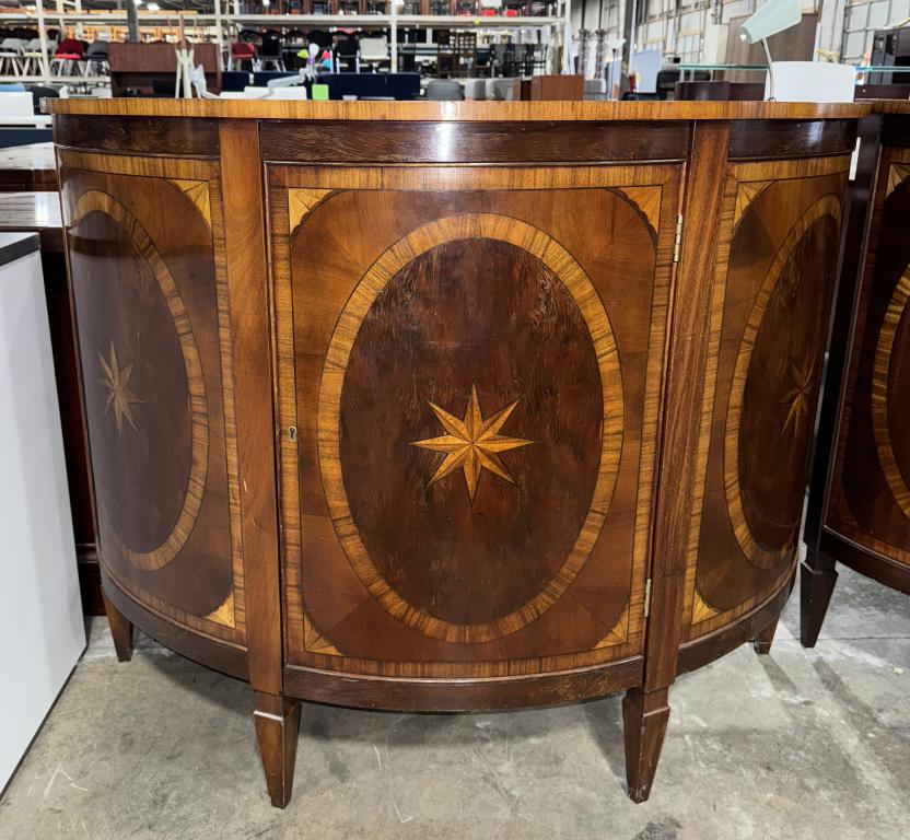 Description Infuse your home with timeless elegance with this Trosby England Inlay Demi Lune server. Crafted with exquisite detail, this antique beauty features a central door that opens to reveal two shelves, perfect for storing your treasures.*WHS_0524*HE