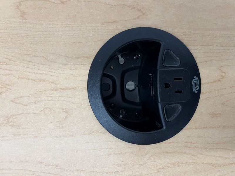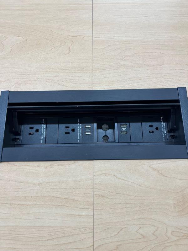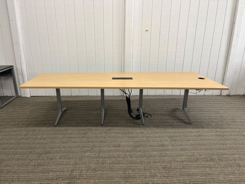 Description Maple laminate trapezoid-shaped conference table. Supported by (4) silver t-shaped legs. (2) Power modules; (1) rectangular 3-outlet module in center, and (1) circular 1-outlet module on wider end.