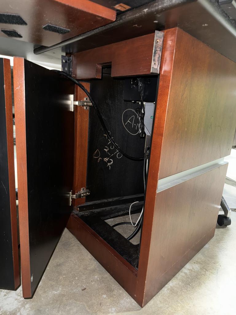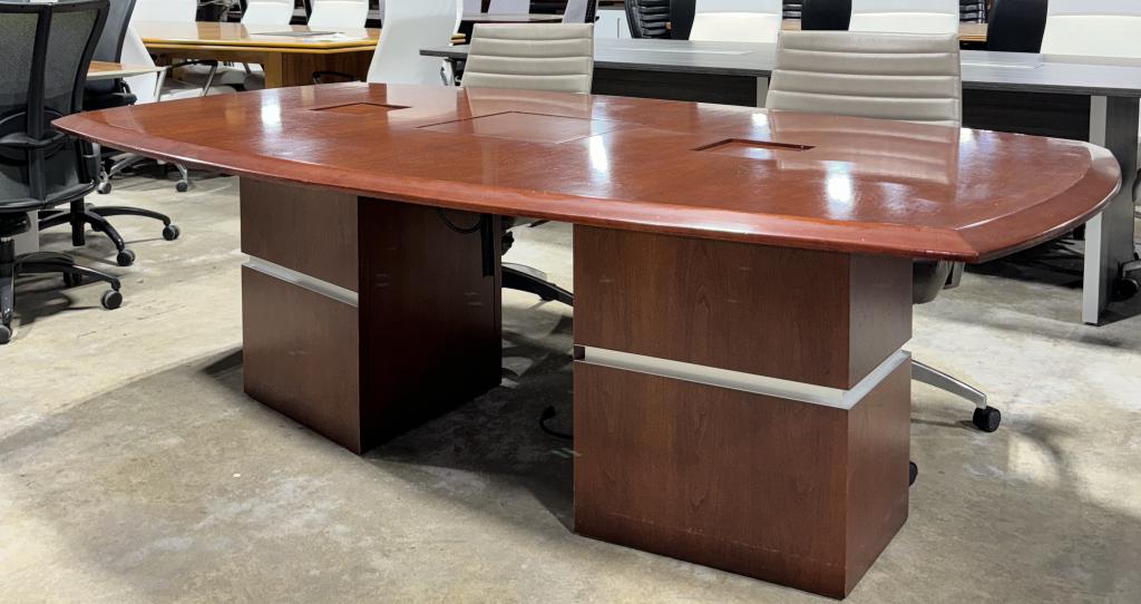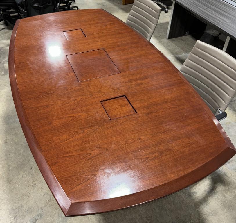 Description Make your meetings memorable with this 7.5' conference table! This cherry veneer beauty comfortably seats 8 and comes equipped with power outlets and data ports. Hide your Polycom system discreetly with a flip-over door in the center, ensuring seamless collaboration. Plus, enjoy added functionality with hidden cabinetry on either side of the inner bases for cable management.*WHS_0524*