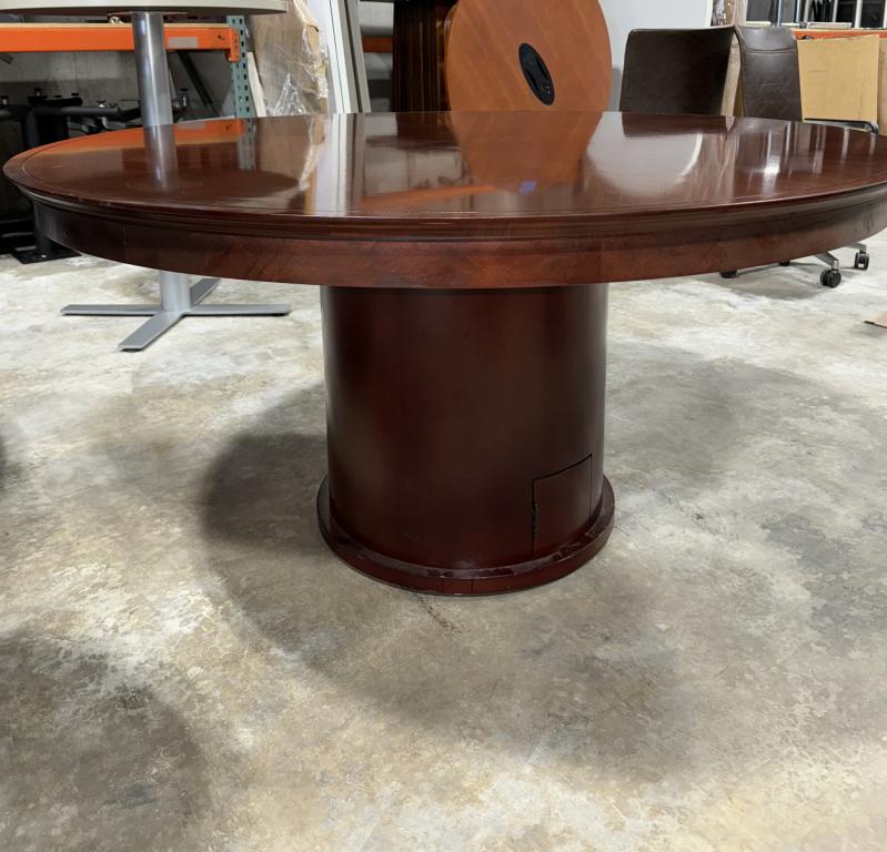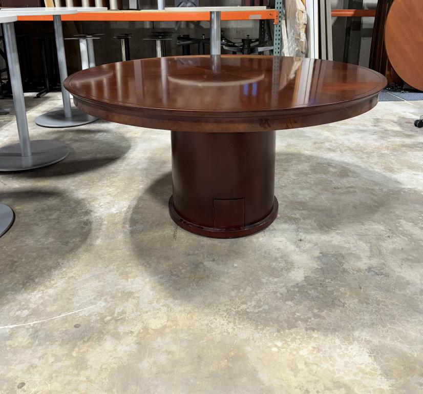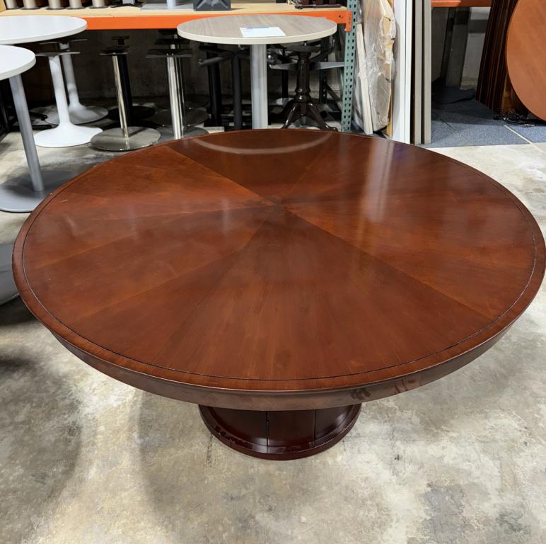 Description This charismatic five inch round table has a transitional appeal with its rich sunburst table top design. Crafted from sold wood with an oak cherry finish. Can comfortably seat up to six people with a considerable amount of surface space.*WHS_0524*