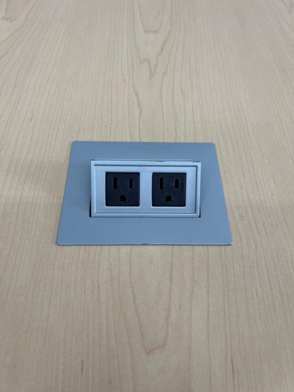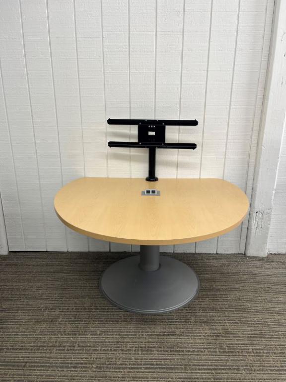Description Allsteel maple laminate peninsula table with (1) two-outlet power module and black monitor/TV arm. Round silver base. Max weight for monitor arm is 125 lbs. Dimensions: 48" long x 54" wide. Table #65.