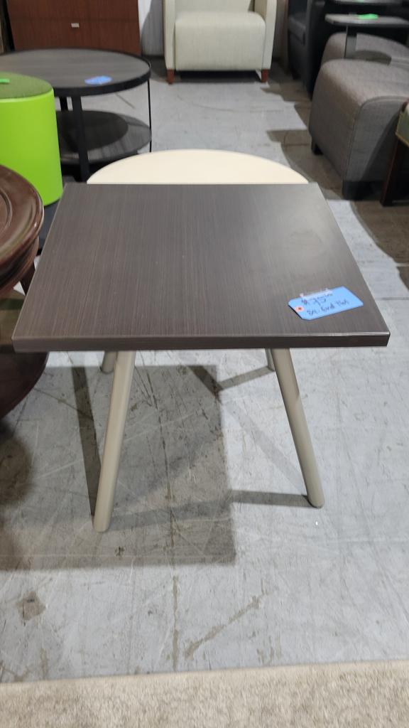 Description Espresso Square End Table. Contemporary laminate table with brushed nickel legs. Perfect for any living area, home office, or work space!
