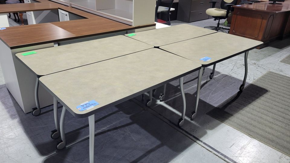 Description Beige Mobile Training Table. Contemporary mobile table with silver legs and wheels for mobility. Ideal for any office space, break room, or other work area.